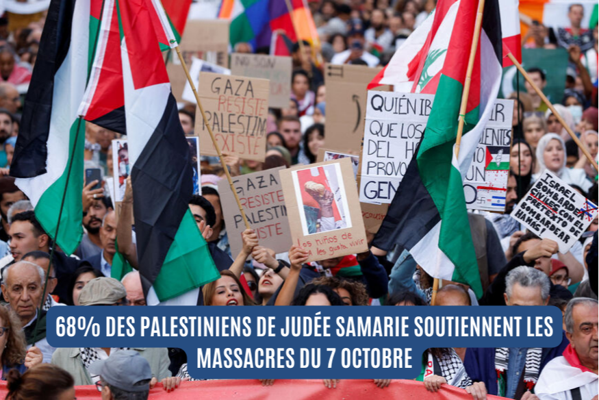 Une enquête menée par l'université palestinienne Beir Zeit, révèle que 68% des Palestiniens de Judée Samarie soutiennent le massacre du 7 octobre perpétré par le Hamas en Israël, dont le bilan on le rappelle est de plus de 1200 victimes et de 240 otages emmenés à Gaza.