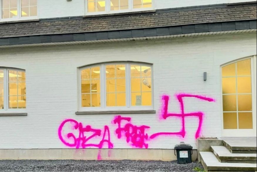 Des tags représentants une croix gammée avec l’inscription “Gaza free” (Gaza Libre) ont été retrouvés sur un bâtiment à Fléron près de Liège en Belgique