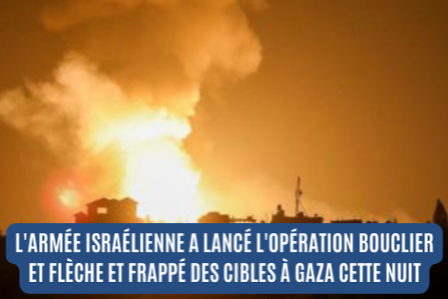 L'armée israélienne lance l'opération Bouclier et Flèche et frappe des cibles à Gaza. Trois terroristes importants du Jihad islamique ont été éliminés dans ces frappes effectuées cette nuit à Gaza notamment.