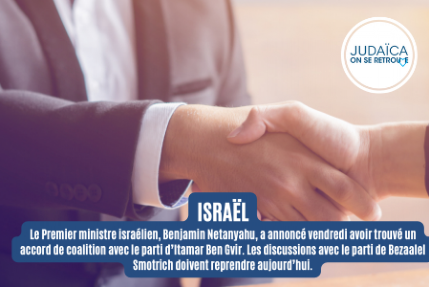 Le Premier ministre israélien, Benjamin Netanyahu, a annoncé vendredi avoir trouvé un accord de coalition avec le parti Otzma Yehudit d’Itamar Ben Gvir.