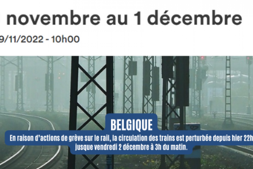En raison d’actions de grève sur le rail, la circulation des trains est perturbée depuis hier 22h jusque vendredi 2 décembre à 3h du matin