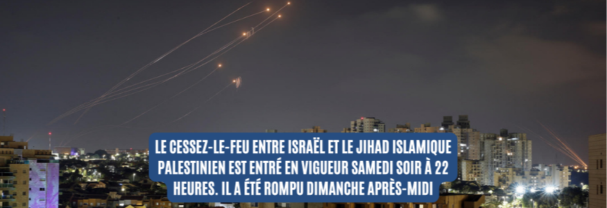 Un fragile cessez-le-feu négocié par l'Égypte entre Israël et le Jihad islamique palestinien est entré en vigueur samedi soir à 22 heures. Il a été rompu dimanche après-midi par des tirs de roquettes en direction des localités frontalières de Gaza et d'Ashkelon.