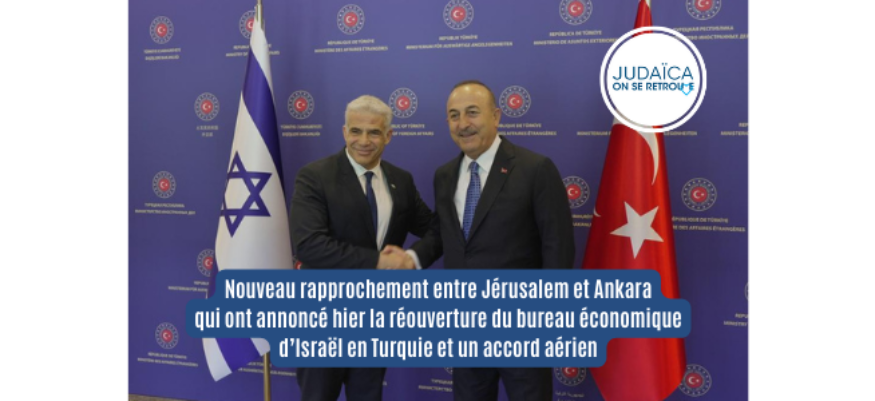 Nouveau rapprochement entre Jérusalem et Ankara qui ont annoncé hier la réouverture du bureau économique d’Israël en Turquie et un accord aérien. Yitzhak Herzog a fini la journée en appelant Recep Tayyip Erdoğan, pour lui présenter ses voeux à l'occasion de la fête musulmane de l'Aïd el kebir.